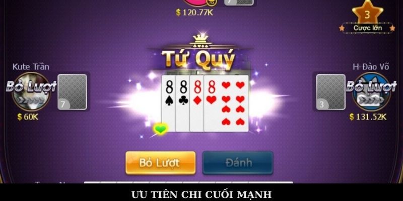 Chi cuối thường đóng vai trò quyết định kết quả chung cuộc của ván đấu. Vì vậy, bạn nên dồn các lá bài mạnh nhất vào chi cuối, đặc biệt là các tổ hợp như thùng, sảnh, hoặc tứ quý. Điều này sẽ giúp bạn gia tăng khả năng chiến thắng ở chi quan trọng này, từ đó mang lại lợi thế lớn hơn trong cuộc chơi.