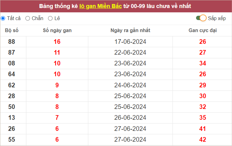 ⭐️Lô gan MB lâu ra nhất: 88 – 87 – 08 – 64 – 62