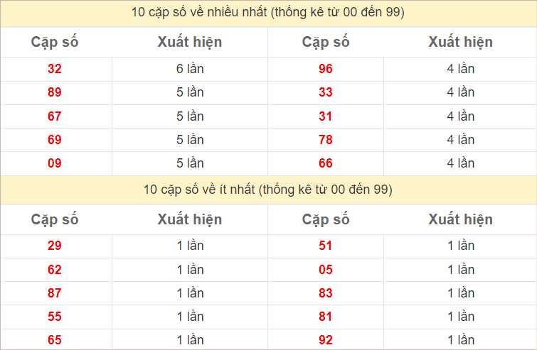 ⭐️ Thống kê tần suất các cặp lô về nhiều trong 10 ngày gần đây: 82 (7 lần), 04, 23 (6 lần), 14, 16, 45, 46, 63 (5 lần)
