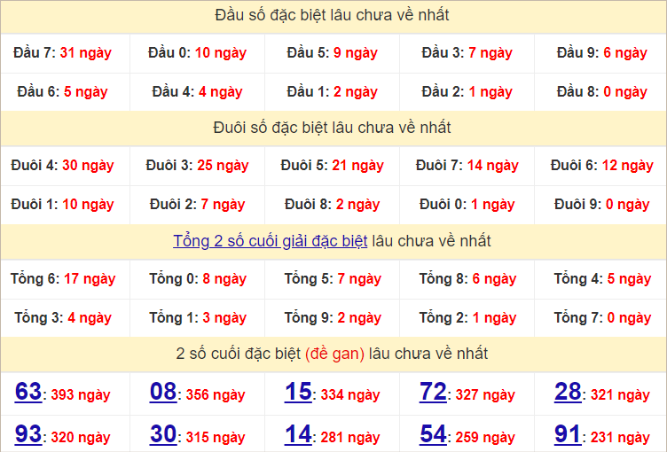 | Con số | Số ngày chưa ra | Ngày ra gần nhất | Gan cực đại |