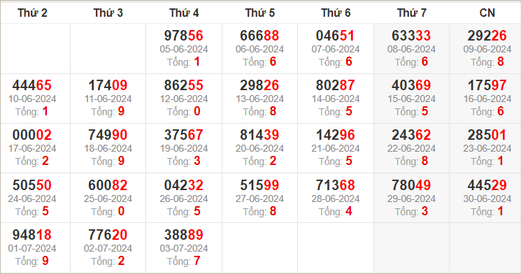 | Ngày | Giải ĐB | Ngày | Giải ĐB | Ngày | Giải ĐB |