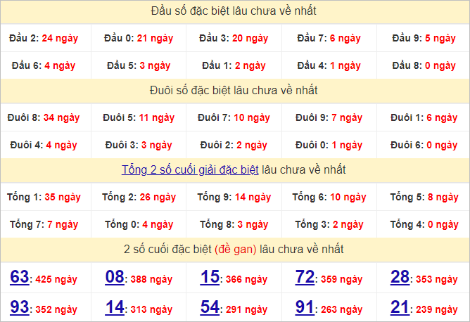 | Con số | Số ngày chưa ra | Ngày ra gần nhất | Gan cực đại |