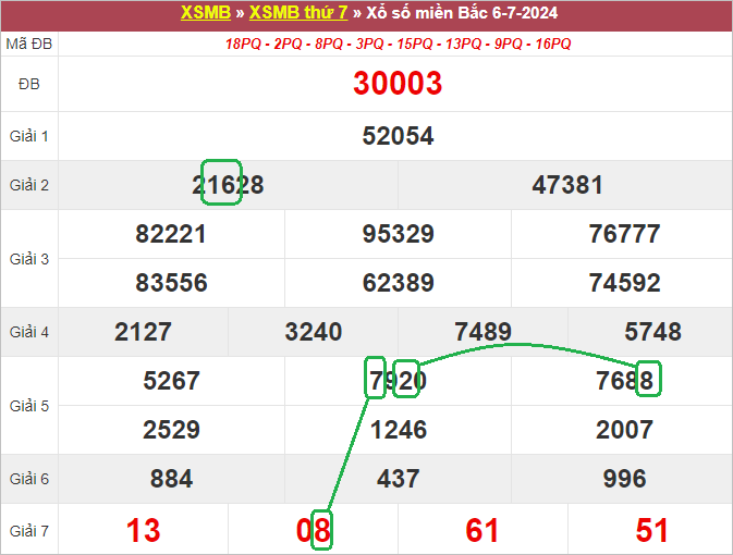 ⭐ Thống kê 30 kỳ quay giải đặc biệt XSMB tính đến ngày 7-7-2024: