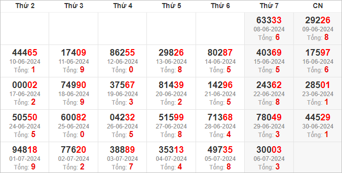 | Ngày | Giải ĐB | Ngày | Giải ĐB | Ngày | Giải ĐB |