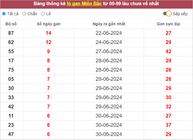⭐️ Lô gan XSMB lâu ra nhất: 87 – 62 – 55 – 17 – 75